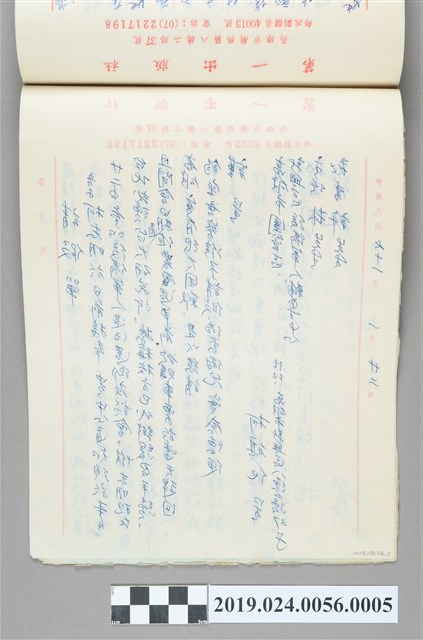 1.柯旗化1982年1月22日信箋複寫存底,寄給高雄市團管區、新興區後備軍人輔導中心秘書之信件;為長子柯志明向後備軍人退伍還鄉座談會請假,因為柯志明正在就讀研究所以辦緩召。共1張信紙。2.第一出版社使用的信箋,柯旗化在1976年第二次出獄後在第一出版社的經營上開始使用信箋簿,主要是將寄出去的信件內容,透過複寫紙在信箋簿上留存,並持續這個習慣一直到1995年,與其他遭受過白色恐怖的受害者一樣,言行都會格外謹慎,何況是還處於戒嚴時期的信件,深恐又被莫名逮捕入獄,此類信箋簿本捐贈案收藏非常完整,包括從1976年至1995年間的信箋簿,而大部分的信箋內容主要還是以出版社業務(估價、訂購書籍回函等等)為主,頁中不時夾帶郵政匯票收據。