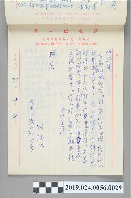 2019.024.0056.0029 1983年11月4日柯旗化訂購《詩人坊》雜誌之信件