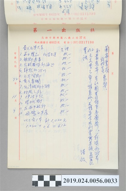2019.024.0056.0033 1983年11月7日柯旗化向蘭亭書店購書之信件