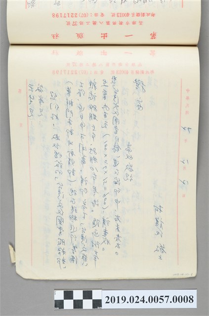 2.第一出版社使用的信箋,柯旗化在1976年第二次出獄後在第一出版社的經營上開始使用信箋簿,主要是將寄出去的信件內容,透過複寫紙在信箋簿上留存,並持續這個習慣一直到1995年,與其他遭受過白色恐怖的受害者一樣,言行都會格外謹慎,何況是還處於戒嚴時期的信件,深恐又被莫名逮捕入獄,此類信箋簿本捐贈案收藏非常完整,包括從1976年至1995年間的信箋簿,而大部分的信箋內容主要還是以出版社業務(估價、訂購書籍回函等等)為主,頁中不時夾帶郵政匯票收據。