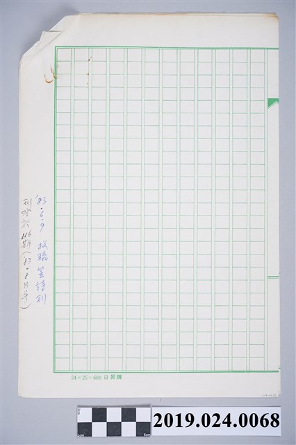 1.柯旗化中文詩作〈猛醒〉複寫稿,1983年6月9日投稿笠詩刊,刊登於1983年8月號,共2頁。2.柯旗化於1982年完成最後一本英文教科書後,便一心轉向投入宣揚台灣意識的文化事業,包括編寫《台灣文化圖書目錄》與創辦《台灣文化》季刊之外,也積極撰寫詩作、社論投稿到台、日等報章雜誌,多數投稿在《台灣文藝》雜誌雙月刊、《笠》詩刊、《民眾日報》天聲人語專欄等等,此時期的柯旗化企圖跳脫白色恐怖冤獄的陰影,反而更無畏、積極地為自己的政治理念發聲,另外,柯旗化從創作詩開始便有將其作品轉譯成台語、日語、英語的習慣,於文章的寫作也是如此,因此可以發現因為語言版本的關係也有一稿多投得情況。本捐贈案文物囊括柯旗化生前最完整的親筆手稿(複寫稿),十分珍貴,其中又以未刊登或未註明投稿的手稿為最多,共收藏有146件(包含複寫稿)、其次是柯旗化投稿於《台灣文藝》季刊的作品42件,以及《民眾日報》天聲人語專欄刊登的社論32件,其餘數件刊登於《笠》詩刊、《台灣詩季刊》、《文學界》等等。