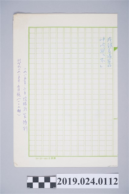 1.柯旗化中文詩作〈沉淪的故鄉〉複寫稿,1985年2月投稿於《笠》詩刊,刊登於1985年6月號(一二七期)。2.柯旗化於1982年完成最後一本英文教科書後,便一心轉向投入宣揚台灣意識的文化事業,包括編寫《台灣文化圖書目錄》與創辦《台灣文化》季刊之外,也積極撰寫詩作、社論投稿到台、日等報章雜誌,多數投稿在《台灣文藝》雜誌雙月刊、《笠》詩刊、《民眾日報》天聲人語專欄等等,此時期的柯旗化企圖跳脫白色恐怖冤獄的陰影,反而更無畏、積極地為自己的政治理念發聲,另外,柯旗化從創作詩開始便有將其作品轉譯成台語、日語、英語的習慣,於文章的寫作也是如此,因此可以發現因為語言版本的關係也有一稿多投得情況。本捐贈案文物囊括柯旗化生前最完整的親筆手稿(複寫稿),十分珍貴,其中又以未刊登或未註明投稿的手稿為最多,共收藏有146件(包含複寫稿)、其次是柯旗化投稿於《台灣文藝》季刊的作品42件,以及《民眾日報》天聲人語專欄刊登的社論32件,其餘數件刊登於《笠》詩刊、《台灣詩季刊》、《文學界》等等。