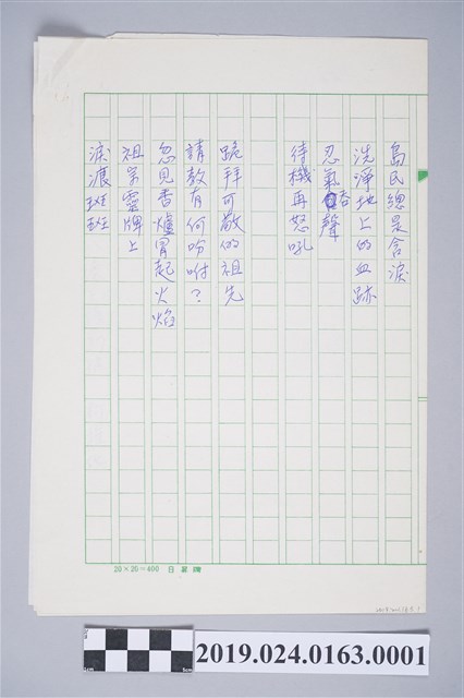 2019.024.0163.0002 柯旗化詩作〈祖宗之淚〉複寫稿