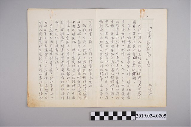 2019.024.0205 柯旗化《台灣監獄島》之序手稿