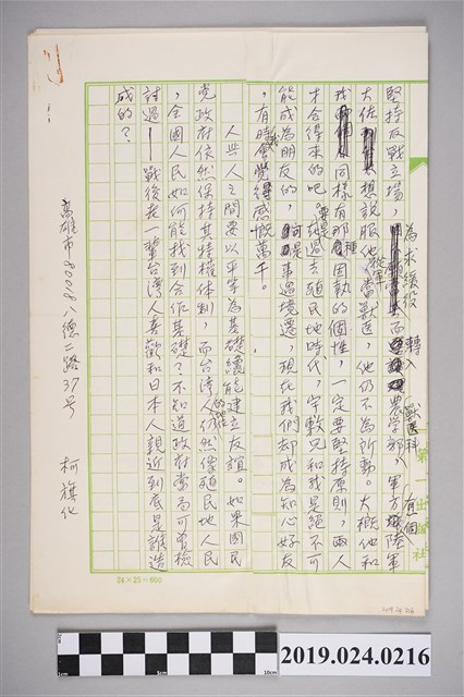 1.柯旗化中文文章〈事過境遷重建友誼〉手稿,文中註記的「春秋隨筆」應為報章之專欄名稱,內容敘述在台灣脫離日本殖民統治後,作者因機緣與日本人建立友誼,並體悟在殖民的不平等關係下是不可能有友誼的,註明本名柯旗化、第一出版社住址,共計三張稿紙。2.柯旗化於1982年完成最後一本英文教科書後,便一心轉向投入宣揚台灣意識的文化事業,包括編寫《台灣文化圖書目錄》與創辦《台灣文化》季刊之外,也積極撰寫詩作、社論投稿到台、日等報章雜誌,多數投稿在《台灣文藝》雜誌雙月刊、《笠》詩刊、《民眾日報》天聲人語專欄等等,此時期的柯旗化企圖跳脫白色恐怖冤獄的陰影,反而更無畏、積極地為自己的政治理念發聲,另外,柯旗化從創作詩開始便有將其作品轉譯成台語、日語、英語的習慣,於文章的寫作也是如此,因此可以發現因為語言版本的關係也有一稿多投得情況。本捐贈案文物囊括柯旗化生前最完整的親筆手稿(複寫稿),十分珍貴,其中又以未刊登或未註明投稿的手稿為最多,共收藏有146件(包含複寫稿)、其次是柯旗化投稿於《台灣文藝》季刊的作品42件,以及《民眾日報》天聲人語專欄刊登的社論32件,其餘數件刊登於《笠》詩刊、《台灣詩季刊》、《文學界》等等。