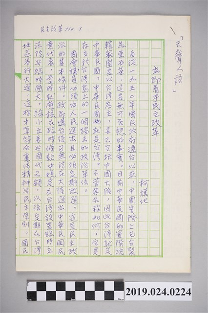 2019.024.0224 柯旗化文章〈立即著手民主改革〉手稿