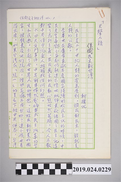 2019.024.0229 柯旗化文章〈保衛民主新台灣〉手稿