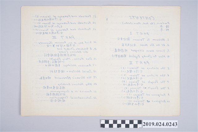 柯旗化《高級活用英語會話》目次手稿,為柯旗化和柯志明美國紐約州立大學教授Mark Selden合編的英語會話書。柯旗化與Mark Selden教授透過為讓柯志明借助家中的機緣下通信雙方開始互相熟識,日後並一同計畫合編英語教科書《高級活用英語會話》,期間也曾飛來台灣2個月進行錄音工作,可惜最後沒能出版,僅以部分內容刊登在《台灣文化》季刊後面,不過還是留下了此教科書的編輯稿(相關文物編號106041-0240~0262)。