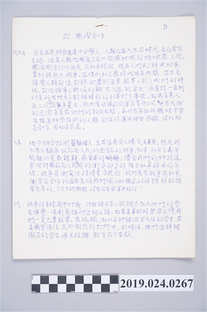 2019.024.0267 柯旗化《高級活用英語會話》中文內文手稿-第22節〈國際合作〉