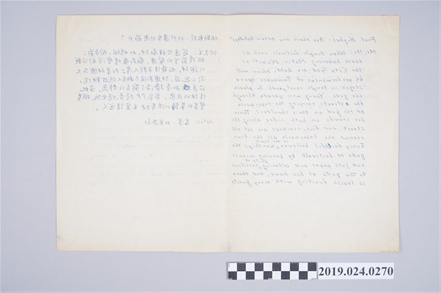 柯旗化《高級活用英語會話》中文內文草稿-〈台灣的節日與風俗〉,內容主要是假設一名美國教授和台灣男性討論台灣的風俗與節日,其內容包含英文草稿和一段柯旗化寫給Professor Selden的信,請他代為訂正此段。柯旗化與Mark Selden教授透過為讓柯志明借助家中的機緣下通信雙方開始互相熟識,日後並一同計畫合編英語教科書《高級活用英語會話》,期間也曾飛來台灣2個月進行錄音工作,可惜最後沒能出版,僅以部分內容刊登在《台灣文化》季刊後面,不過還是留下了此教科書的編輯稿(相關文物編號106041-0240~0262)。