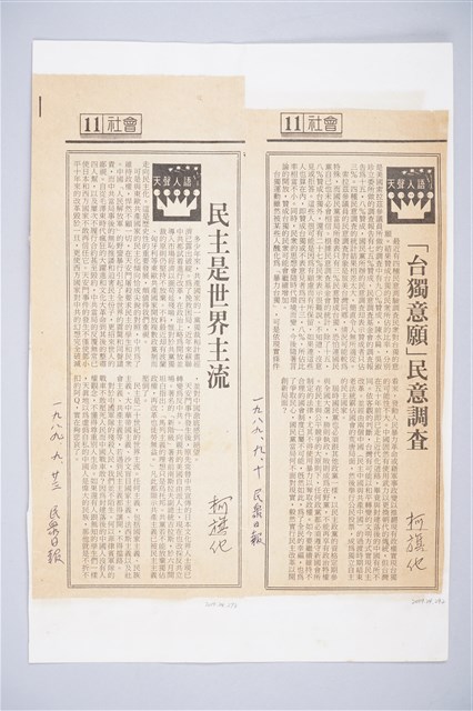 1.中文文章〈「台獨意願」民意調查〉剪報,民眾日報「天聲人語」專欄,引用當時民意調查基金會的數據,認為1989年台灣人贊成台獨的比例為15.8%,若加上因為顧慮投下難說、不願回答的部分,應該會有近43.8%贊成台獨的,故呼籲當局面對民意現實,實行民主改革,報導旁作者寫下「一九八九、九、十 民眾日報」,與下一則共同黏貼於白紙上。 2.柯旗化於1982年完成最後一本英文教科書後,便一心轉向投入宣揚台灣意識的文化事業,包括編寫《台灣文化圖書目錄》與創辦《台灣文化》季刊之外,也積極撰寫詩作、社論投稿到台、日等報章雜誌,多數投稿在《台灣文藝》雜誌雙月刊、《笠》詩刊、《民眾日報》天聲人語專欄等等,此時期的柯旗化企圖跳脫白色恐怖冤獄的陰影,反而更無畏、積極地為自己的政治理念發聲,另外,柯旗化從創作詩開始便有將其作品轉譯成台語、日語、英語的習慣,於文章的寫作也是如此,因此可以發現因為語言版本的關係也有一稿多投得情況。本捐贈案文物囊括柯旗化生前最完整的親筆手稿(複寫稿),十分珍貴,其中又以未刊登或未註明投稿的手稿為最多,共收藏有146件(包含複寫稿)、其次是柯旗化投稿於《台灣文藝》季刊的作品42件,以及《民眾日報》天聲人語專欄刊登的社論32件,其餘數件刊登於《笠》詩刊、《台灣詩季刊》、《文學界》等等。