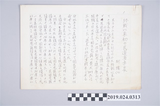 2019.024.0313 柯旗化文章〈終戰以來第一次的民選省市長〉日文手稿