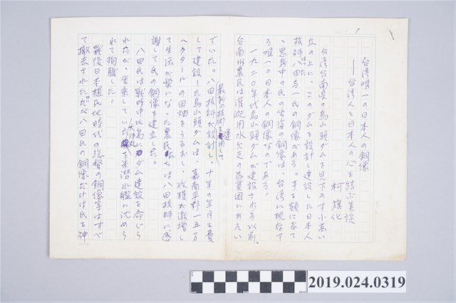 2019.024.0319 柯旗化文章〈台灣唯一的日本人的銅像-台灣人與日本人交心的美談〉日文手稿