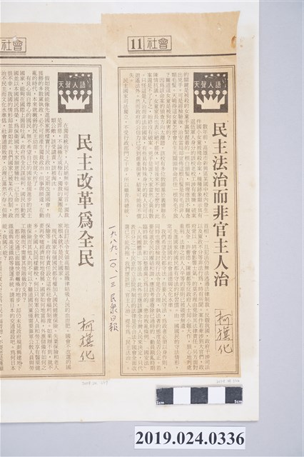 2019.024.0336 1989年10月13日《民眾日報》刊登柯旗化文章〈民主法治而非官主人治〉剪報