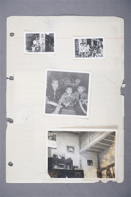 1.柯旗化獄中收到相片,由左至右:柯潔芳、柯志哲、柯志明合影於六合一路第一出版社,約民國51年初。2.柯旗化在第二次入獄後,於獄中合作社買了活頁筆記本代替相簿,筆記本用黑線穿好,封面寫上”Album”字樣,將入獄期間家人寄來的相片全部浮貼或夾在相簿裡,共有142張相片,部分相片柯蔡阿李也在其背面寫下貼心註記。在照相機還不普及的五十年前,柯旗化的妻子柯蔡阿李便用照片用心的記錄家庭生活給獄中不見天日的柯旗化,也讓兒女透過相片,對鏡頭另一端的缺席的父親有了想像。