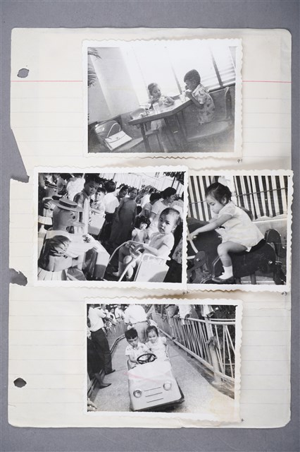 1.柯旗化獄中收到相片,右一正對鏡頭者為柯潔芳,相片背面柯蔡阿李寫道:「在大新五樓兒童樂園1962. 9. 28」(註:大新百貨,在高雄市鹽埕區)2.柯旗化在第二次入獄後,於獄中合作社買了活頁筆記本代替相簿,筆記本用黑線穿好,封面寫上”Album”字樣,將入獄期間家人寄來的相片全部浮貼或夾在相簿裡,共有142張相片,部分相片柯蔡阿李也在其背面寫下貼心註記。在照相機還不普及的五十年前,柯旗化的妻子柯蔡阿李便用照片用心的記錄家庭生活給獄中不見天日的柯旗化,也讓兒女透過相片,對鏡頭另一端的缺席的父親有了想像。