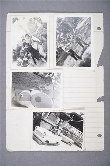 1.柯旗化獄中收到相片,小孩由左至右:柯潔芳、柯志明在開碰碰車。相片背面柯蔡阿李寫道:「在台北兒童樂園 1963. 1. 31」2.柯旗化在第二次入獄後,於獄中合作社買了活頁筆記本代替相簿,筆記本用黑線穿好,封面寫上”Album”字樣,將入獄期間家人寄來的相片全部浮貼或夾在相簿裡,共有142張相片,部分相片柯蔡阿李也在其背面寫下貼心註記。在照相機還不普及的五十年前,柯旗化的妻子柯蔡阿李便用照片用心的記錄家庭生活給獄中不見天日的柯旗化,也讓兒女透過相片,對鏡頭另一端的缺席的父親有了想像。