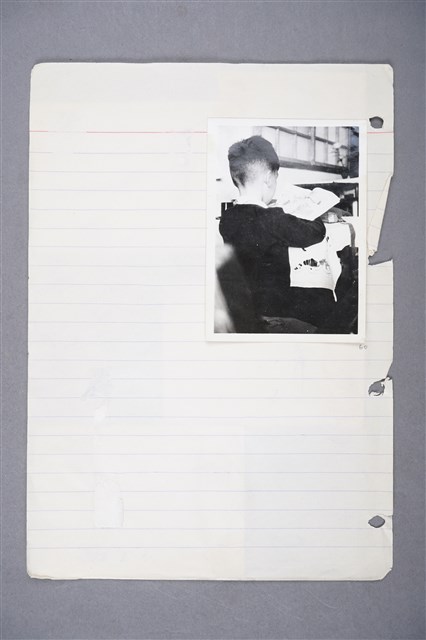 1.柯旗化獄中收到相片,長子柯志明看書的照片。相片背面柯蔡阿李寫道:「1964.2」2.柯旗化在第二次入獄後,於獄中合作社買了活頁筆記本代替相簿,筆記本用黑線穿好,封面寫上”Album”字樣,將入獄期間家人寄來的相片全部浮貼或夾在相簿裡,共有142張相片,部分相片柯蔡阿李也在其背面寫下貼心註記。在照相機還不普及的五十年前,柯旗化的妻子柯蔡阿李便用照片用心的記錄家庭生活給獄中不見天日的柯旗化,也讓兒女透過相片,對鏡頭另一端的缺席的父親有了想像。