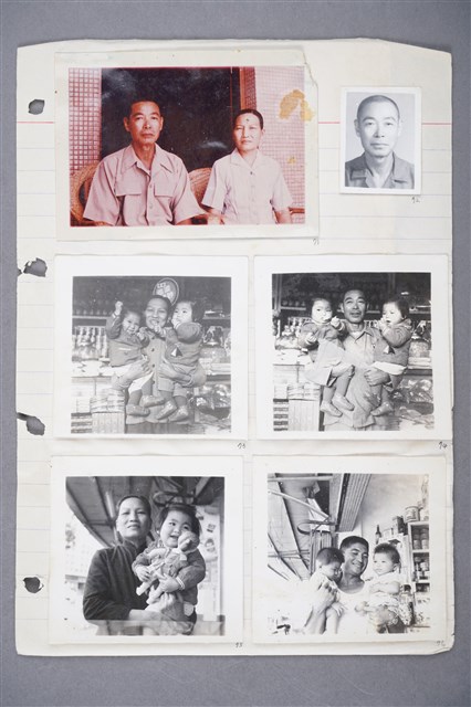 1.柯旗化獄中收到相片,父親柯松木抱著柯旗化的兩名姪女合影,於左營自家食品行2.柯旗化在第二次入獄後,於獄中合作社買了活頁筆記本代替相簿,筆記本用黑線穿好,封面寫上”Album”字樣,將入獄期間家人寄來的相片全部浮貼或夾在相簿裡,共有142張相片,部分相片柯蔡阿李也在其背面寫下貼心註記。在照相機還不普及的五十年前,柯旗化的妻子柯蔡阿李便用照片用心的記錄家庭生活給獄中不見天日的柯旗化,也讓兒女透過相片,對鏡頭另一端的缺席的父親有了想像。