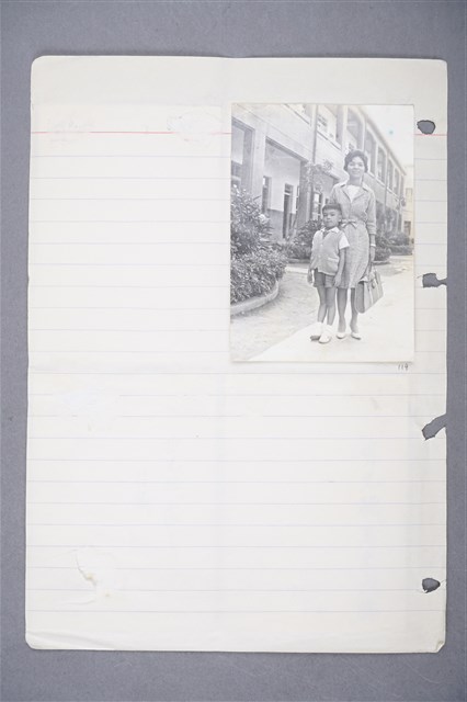 1.柯旗化獄中收到相片,柯旗化獄中收到相片,柯志哲與柯蔡阿李在花圃前合照2.柯旗化在第二次入獄後,於獄中合作社買了活頁筆記本代替相簿,筆記本用黑線穿好,封面寫上”Album”字樣,將入獄期間家人寄來的相片全部浮貼或夾在相簿裡,共有142張相片,部分相片柯蔡阿李也在其背面寫下貼心註記。在照相機還不普及的五十年前,柯旗化的妻子柯蔡阿李便用照片用心的記錄家庭生活給獄中不見天日的柯旗化,也讓兒女透過相片,對鏡頭另一端的缺席的父親有了想像。