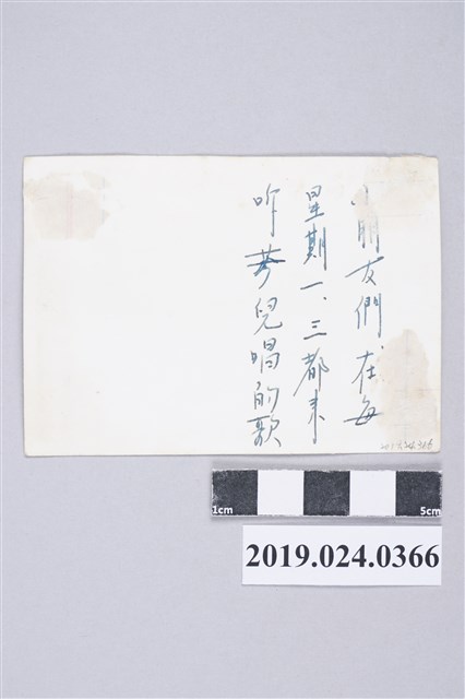 1.柯旗化獄中收到照片,柯旗化子女柯志明(左一)、柯潔芳(左三)與鄰居小孩在六合一路家中客廳,照片中間為電唱機,「小朋友們在每星期一、三都來听芳兒唱歌」2.柯旗化在第二次入獄後,於獄中合作社買了活頁筆記本代替相簿,筆記本用黑線穿好,封面寫上”Album”字樣,將入獄期間家人寄來的相片全部浮貼或夾在相簿裡,此相片背部有被撕落的殘膠,原先夾於相簿中但目前已離開相簿另外存放,此類脫簿的照片共有46張 ,部分相片柯蔡阿李也在其背面寫下貼心註記。在照相機還不普及的五十年前,柯旗化的妻子柯蔡阿李便用照片用心的記錄家庭生活給獄中不見天日的柯旗化,也讓兒女透過相片,對鏡頭另一端的缺席的父親有了想像。