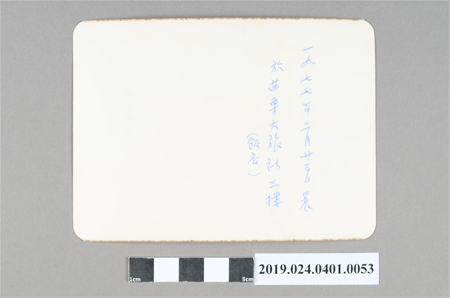柯旗化1977年2月23日攝,妻柯蔡阿李、長子柯志明於苗栗大旅社房間陽台的照片。相片背面柯旗化寫道:「一九七七年二月廿三日 晨 於苗栗大旅社三樓(飯店)」彩色照片。
