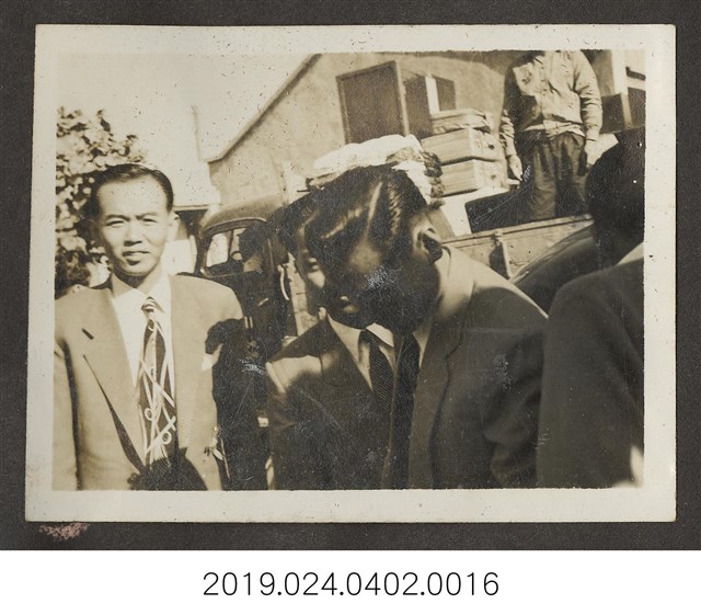 柯旗化1955年結婚當天,新郎與伴郎,背景是停在女方家門前嫁妝車,右二為柯旗化。