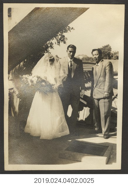 柯旗化1955年結婚當天,準備進入家門,右一伴郎陳文波,右二柯旗化夫婦。