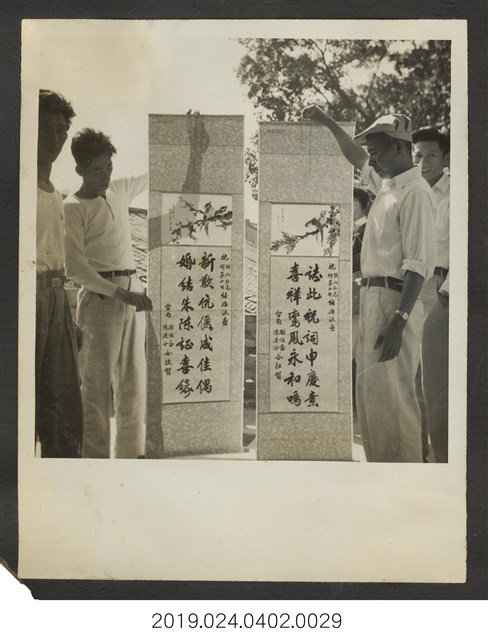 柯旗化1955年結婚當天,新婚賀喜對聯照片,相中對聯「誌次祝詞申慶意,喜祥鸞鳳永和鳴」、「新歡伉儷成佳偶,婚結朱陳証喜緣」。