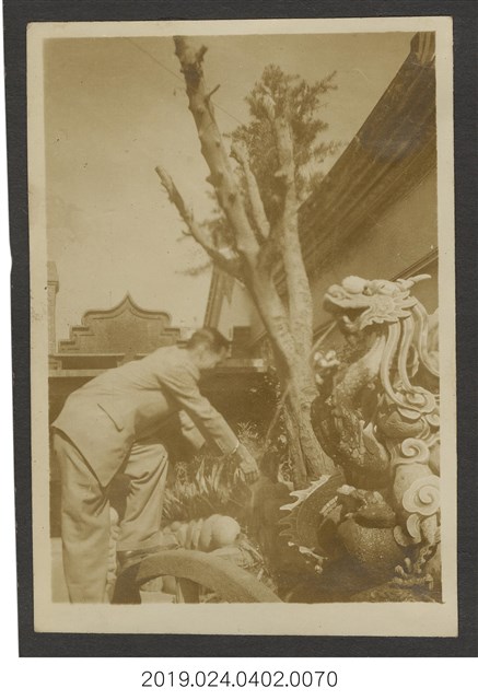 柯旗化1955年12月12日蜜月旅行,於北港媽祖廟留影,照片中柯旗化在掬廟中噴泉的水。