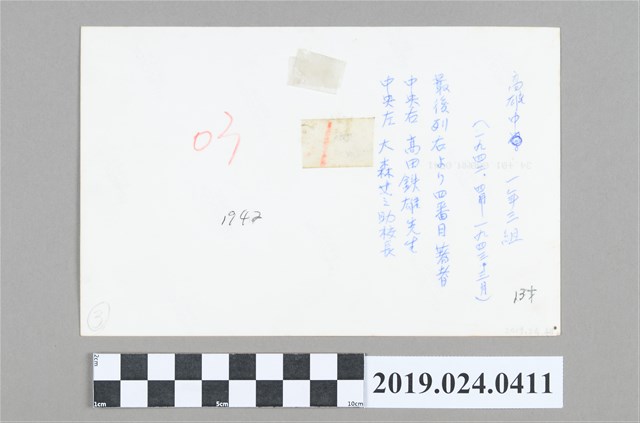 1942年柯旗化就讀於高雄中學一年三組時的合照,後排右4為柯旗化,中間右邊為導師高田鐵雄。