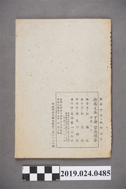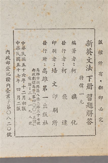 1.柯旗化編著《新英文法(下冊)習題解答》,1967年12月發行初版,此版本為1968年4月二版,由第一出版社出版。發行者為柯飛達(柯旗化三弟),印刷者:培文印書局,當時特價1元。2.柯旗化的英語教科書事業啟蒙源於1955年,當時柯旗化遭受朋友背信而積欠負債,因而決定在自家開設了補習班補貼家用,期間整理編寫第一本《初中英語手冊》不久便獲得廣大學生迴響,當時委外印刷卻供不應求的現象,也使柯旗化於1958年自行成立第一出版社,開啟他的教科書出版事業,其中1960年出版的《新英文法》等書,成為當時英語科最主流的教科書,也是柯旗化最廣為人知的著作。然而隔年柯旗化再度被捕入獄,由妻子柯蔡阿李接下出版社的營運,而柯旗化則是在15年的獄中持續不懈地增訂修改再寄回出版,維持家裡經濟。