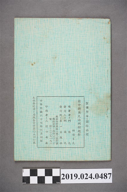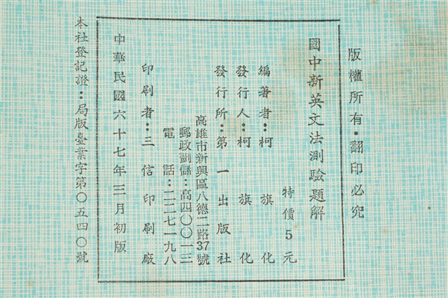 1.柯旗化編著《國中新英文法測驗題解》此版本為1978年3月初版,由第一出版社出版。發行者為柯旗化,當時特價5元。2.柯旗化的英語教科書事業啟蒙源於1955年,當時柯旗化遭受朋友背信而積欠負債,因而決定在自家開設了補習班補貼家用,期間整理編寫第一本《初中英語手冊》不久便獲得廣大學生迴響,當時委外印刷卻供不應求的現象,也使柯旗化於1958年自行成立第一出版社,開啟他的教科書出版事業,其中1960年出版的《新英文法》等書,成為當時英語科最主流的教科書,也是柯旗化最廣為人知的著作。然而隔年柯旗化再度被捕入獄,由妻子柯蔡阿李接下出版社的營運,而柯旗化則是在15年的獄中持續不懈地增訂修改再寄回出版,維持家裡經濟。