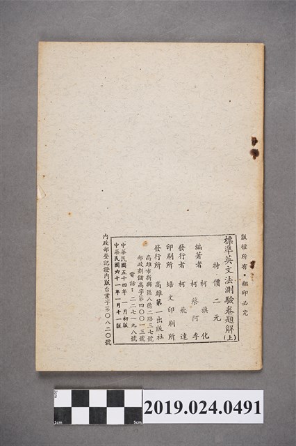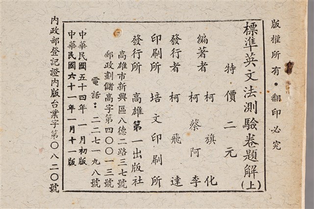 2019.024.0491 柯旗化與柯蔡阿李合編《標準英文法測驗卷(上冊)題解》