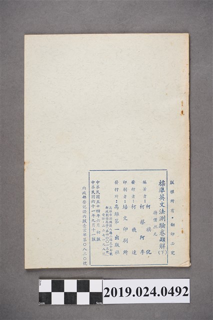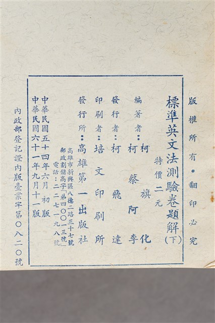 2019.024.0492 柯旗化與柯蔡阿李合編《標準英文法測驗卷(下冊)題解》