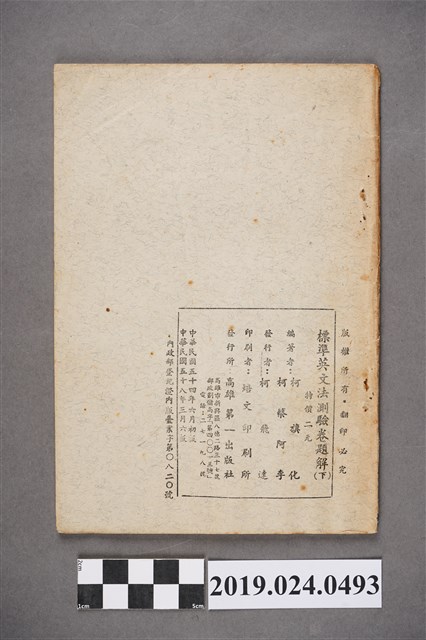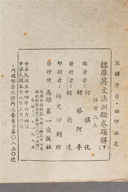 1.柯旗化,柯蔡阿李合編《標準英文法測驗卷(下冊)題解》1965年6月發行初版,此版本為1972年3月六版,由第一出版社出版。發行者為柯飛達(當時第一出版社由柯旗化三弟柯飛達代理),印刷所:培文印刷所,當時特價二元。 2.柯旗化的英語教科書事業啟蒙源於1955年,當時柯旗化遭受朋友背信而積欠負債,因而決定在自家開設了補習班補貼家用,期間整理編寫第一本《初中英語手冊》不久便獲得廣大學生迴響,當時委外印刷卻供不應求的現象,也使柯旗化於1958年自行成立第一出版社,開啟他的教科書出版事業,其中1960年出版的《新英文法》等書,與成為60、70年代英語科最主流的教科書之一,也是柯旗化最廣為人知的著作。然而隔年柯旗化再度被捕入獄,由妻子柯蔡阿李接下出版社的營運,而柯旗化則是在15年的獄中持續不懈地增訂修改再寄回出版,維持家裡經濟。