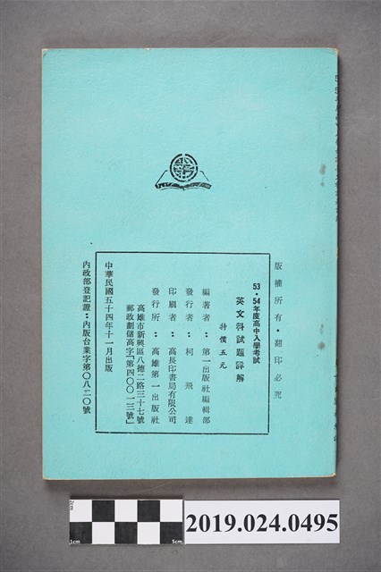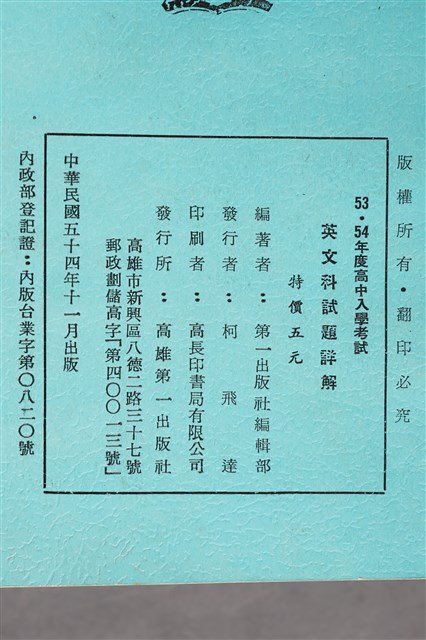 1.柯旗化第一出版社編輯部編著《53、54年度高中入學考試英文科試題詳解》此版本為1965年11月由第一出版社出版,發行者為柯飛達(當時第一出版社由柯旗化三弟柯飛達代理),印刷者:高長印書局有限公司,當時特價5元。2.柯旗化的英語教科書事業啟蒙源於1955年,當時柯旗化遭受朋友背信而積欠負債,因而決定在自家開設了補習班補貼家用,期間整理編寫第一本《初中英語手冊》不久便獲得廣大學生迴響,當時委外印刷卻供不應求的現象,也使柯旗化於1958年自行成立第一出版社,開啟他的教科書出版事業,其中1960年出版的《新英文法》等書,與成為60、70年代英語科最主流的教科書之一,也是柯旗化最廣為人知的著作。然而隔年柯旗化再度被捕入獄,由妻子柯蔡阿李接下出版社的營運,而柯旗化則是在15年的獄中持續不懈地增訂修改再寄回出版,維持家裡經濟。