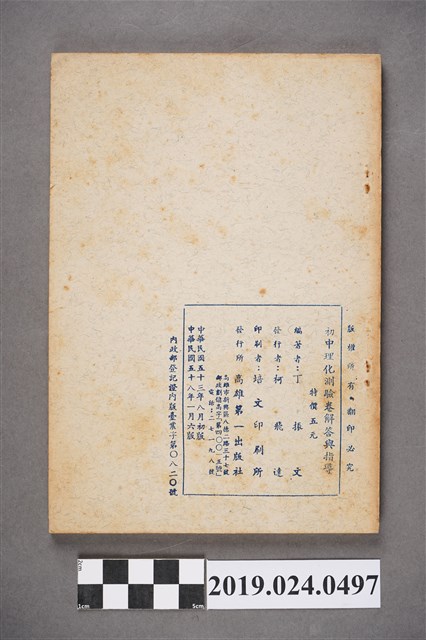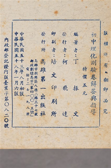 2019.024.0497 丁振文編著《初中理化測驗卷解答與指導》