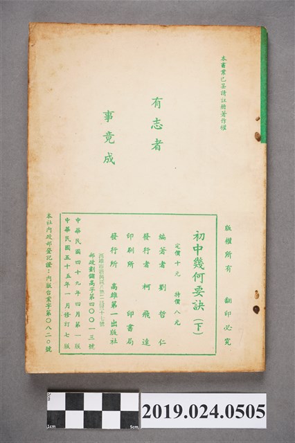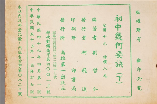 1.柯旗化第一出版社印行,劉哲仁編著《投考必備初中幾何要訣下冊》1950年4月發行第一版,此版本為1966年1月修訂七版。發行者為柯飛達,當時定價10元,特價8元,封面印有「證明要訣、做圖要訣、上冊習題解答」
