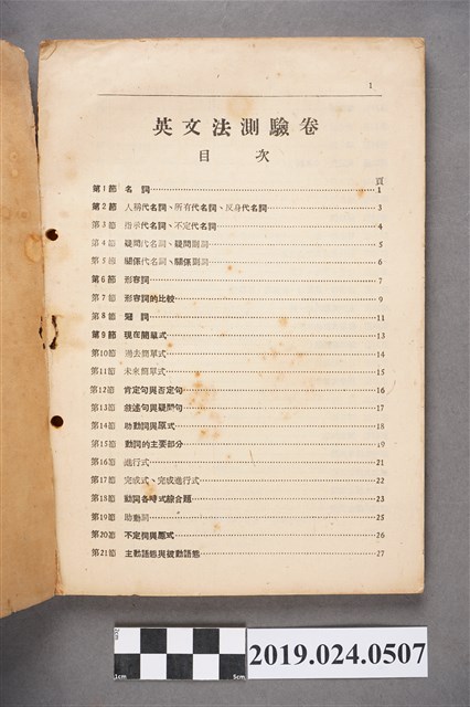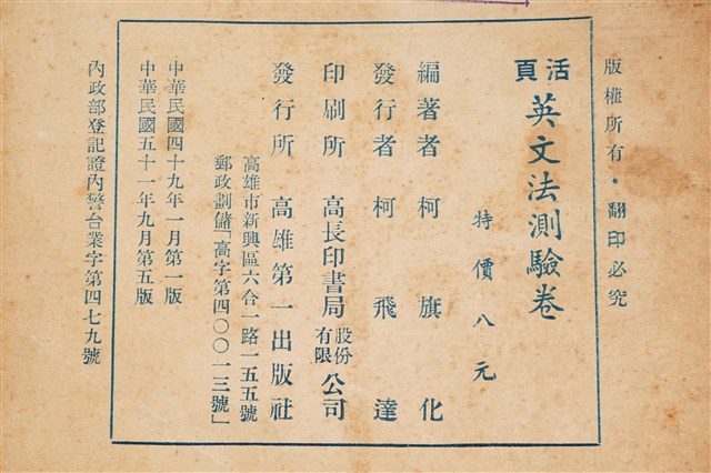 1.柯旗化編著《活頁英文法測驗卷》1960年1月發行第一版,此版本為1962年12月第五版,由高雄第一出版社出版。發行者為柯飛達(柯旗化三弟),印刷者:高長印書局股份有限公司,當時特價8元。封面印有「附最近三年度高中入學英文試題」字樣。 2.柯旗化的英語教科書事業啟蒙源於1955年,當時柯旗化遭受朋友背信而積欠負債,因而決定在自家開設了「第一補習班」補貼家用,期間整理編寫第一本《初中英語手冊》不久便獲得廣大學生迴響,當時委外印刷卻供不應求的現象,也促使柯旗化於1958年自行成立「第一出版社」,開啟他的教科書出版事業,其中1960年出版的《新英文法》等書,成為當時英語科最主流的教科書,也是柯旗化最廣為人知的著作。然而隔年柯旗化再度被捕入獄,由妻子柯蔡阿李接下出版社的營運,而柯旗化則是在15年的獄中持續不懈地增訂修改再寄回出版,支撐了家中的經濟以及獄友,《新英文法》及其教科書也為當時台灣學生銜接國際的橋梁。