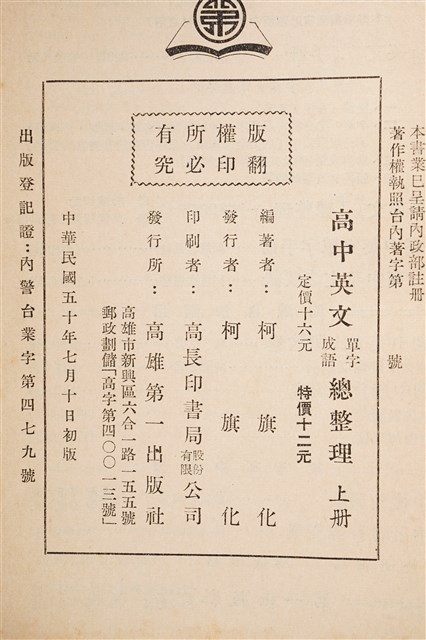 1.柯旗化編著《An Extensive Study of English Words & Phrases For Advanced Student》/《投考大學叢書(一)高中英文單字成語總整理(上冊)》此版本為1961年7月10日發行之初版,由高雄第一出版社出版,當時特價12元,書中內容包括單字測驗4000題、中英雙解英文常用成語800、成語測驗400題、測驗題詳解。 2.柯旗化的英語教科書事業啟蒙源於1955年,當時柯旗化遭受朋友背信而積欠負債,因而決定在自家開設了「第一補習班」補貼家用,期間整理編寫第一本《初中英語手冊》不久便獲得廣大學生迴響,當時委外印刷卻供不應求的現象,也促使柯旗化於1958年自行成立「第一出版社」,開啟他的教科書出版事業,其中1960年出版的《新英文法》等書,成為當時英語科最主流的教科書,也是柯旗化最廣為人知的著作。然而隔年柯旗化再度被捕入獄,由妻子柯蔡阿李接下出版社的營運,而柯旗化則是在15年的獄中持續不懈地增訂修改再寄回出版,支撐了家中的經濟以及獄友,《新英文法》及其教科書也為當時台灣學生銜接國際的橋梁。
