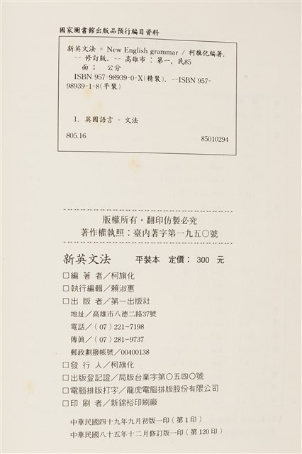 1.柯旗化編著《中學適用New English Grammer新英文法(電腦新排版)》,此版本為民國85年12月修訂版一印(第120印),由第一出版社印行。2.柯旗化的英語教科書事業啟蒙源於1955年,當時柯旗化遭受朋友背信而積欠負債,因而決定在自家開設了補習班補貼家用,期間整理編寫第一本《初中英語手冊》不久便獲得廣大學生迴響,當時委外印刷卻供不應求的現象,也使柯旗化於1958年自行成立第一出版社,開啟他的教科書出版事業,其中1960年出版的《新英文法》等書,成為當時英語科最主流的教科書,也是柯旗化最廣為人知的著作。然而隔年柯旗化再度被捕入獄,而柯旗化將在獄中自殺未遂的鬱卒轉化成撰寫教科書的動力,不久便默默的進行再版的增訂,空前的熱銷也支持著柯旗化再版修訂的工作,由妻子柯蔡阿李接下出版社的營運,而柯旗化則是在15年的獄中持續不懈地增訂修改再寄回出版,維持家裡經濟。3.《新英文法》為柯旗化的重要著作,60年代正逢英語學習熱潮,《新英文法》也成為人手一本拜讀的教科書,空前的熱銷令家人子女得以平穩的渡過柯旗化在獄中的堅苦時期,出獄後也支持著柯旗化有相當的經濟基礎,投入台灣文化書籍等出版事業,對於教育界或 是柯旗化來說,《新英文法》使兩者的成就皆從這本書的基礎上逐漸建構起來。