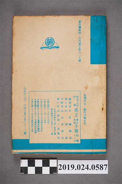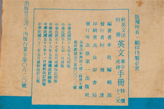 1.柯旗化編著《新英文法附冊英文單字成語手冊(最新改訂版)》,民國49年9月發行初版,民國62年5月最新改訂七版。由第一出版社印行。發行者:柯飛達(柯旗化二弟)。印刷者:高長印書局。特價十二元。註明:附新英文法習題解答。2.柯旗化的英語教科書事業啟蒙源於1955年,當時柯旗化遭受朋友背信而積欠負債,因而決定在自家開設了補習班補貼家用,期間整理編寫第一本《初中英語手冊》不久便獲得廣大學生迴響,當時委外印刷卻供不應求的現象,也使柯旗化於1958年自行成立第一出版社,開啟他的教科書出版事業,其中1960年出版的《新英文法》等書,成為當時英語科最主流的教科書,也是柯旗化最廣為人知的著作。然而隔年柯旗化再度被捕入獄,而柯旗化將在獄中自殺未遂的鬱卒轉化成撰寫教科書的動力,不久便默默的進行再版的增訂,空前的熱銷也支持著柯旗化再版修訂的工作,由妻子柯蔡阿李接下出版社的營運,而柯旗化則是在15年的獄中持續不懈地增訂修改再寄回出版,維持家裡經濟。