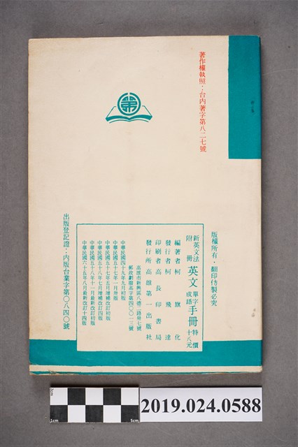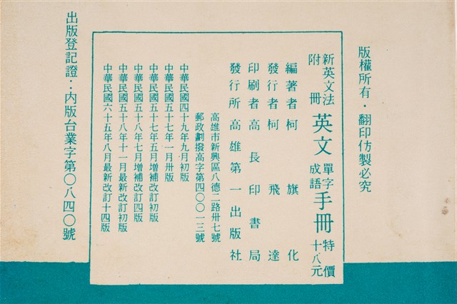 1.柯旗化編著《新英文法附冊英文單字成語手冊(最新改訂版)》,民國49年9月發行初版,此版本為民國65年8月最新改訂十四版,由第一出版社印行,發行者:柯飛達(柯旗化二弟)。印刷者:高長印書局。特價十八元。註明:附新英文法習題解答。2.柯旗化的英語教科書事業啟蒙源於1955年,當時柯旗化遭受朋友背信而積欠負債,因而決定在自家開設了補習班補貼家用,期間整理編寫第一本《初中英語手冊》不久便獲得廣大學生迴響,當時委外印刷卻供不應求的現象,也使柯旗化於1958年自行成立第一出版社,開啟他的教科書出版事業,其中1960年出版的《新英文法》等書,成為當時英語科最主流的教科書,也是柯旗化最廣為人知的著作。然而隔年柯旗化再度被捕入獄,而柯旗化將在獄中自殺未遂的鬱卒轉化成撰寫教科書的動力,不久便默默的進行再版的增訂,空前的熱銷也支持著柯旗化再版修訂的工作,由妻子柯蔡阿李接下出版社的營運,而柯旗化則是在15年的獄中持續不懈地增訂修改再寄回出版,維持家裡經濟。