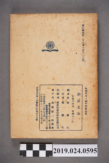 1.柯旗化編著《A New English Grammer For Middle Schools中學適用新英文法》,民國49年9月第一版,此版本為民國51年5月第十版。由第一出版社印行。發行者:柯旗化。印刷者:高長印書局股份有限公司。定價十六元,特價十一元。 2.柯旗化的英語教科書事業啟蒙源於1955年,當時柯旗化遭受朋友背信而積欠負債,因而決定在自家開設了補習班補貼家用,期間整理編寫第一本《初中英語手冊》不久便獲得廣大學生迴響,當時委外印刷卻供不應求的現象,也使柯旗化於1958年自行成立第一出版社,開啟他的教科書出版事業,其中1960年出版的《新英文法》等書,成為當時英語科最主流的教科書,也是柯旗化最廣為人知的著作。然而隔年柯旗化再度被捕入獄,而柯旗化將在獄中自殺未遂的鬱卒轉化成撰寫教科書的動力,不久便默默的進行再版的增訂,空前的熱銷也支持著柯旗化再版修訂的工作,由妻子柯蔡阿李接下出版社的營運,而柯旗化則是在15年的獄中持續不懈地增訂修改再寄回出版,維持家裡經濟。 3.《新英文法》為柯旗化的重要著作,60年代正逢英語學習熱潮,《新英文法》也成為人手一本拜讀的教科書,空前的熱銷令家人子女得以平穩的渡過柯旗化在獄中的堅苦時期,出獄後也支持著柯旗化有相當的經濟基礎,投入台灣文化書籍等出版事業,對於教育界或是柯旗化來說,《新英文法》使兩者的成就皆從這本書的基礎上逐漸建構起來。