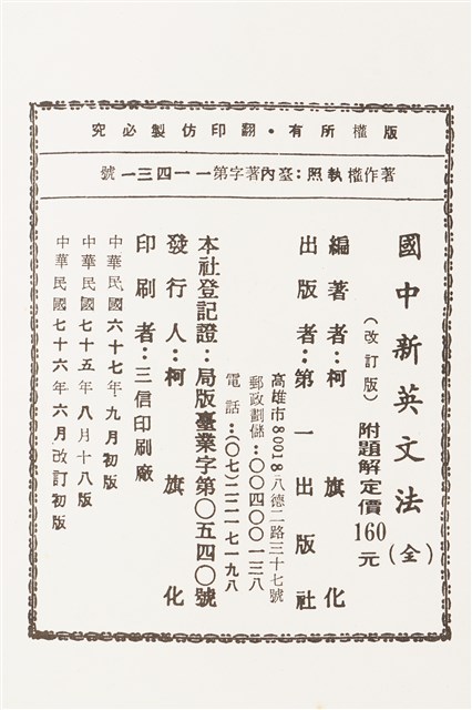 1.柯旗化編著《新版國中新英文法(全冊)》,次版本為民國76年6月改訂初版,由第一出版社印行。2.柯旗化的英語教科書事業啟蒙源於1955年,當時柯旗化遭受朋友背信而積欠負債,因而決定在自家開設了補習班補貼家用,期間整理編寫第一本《初中英語手冊》不久便獲得廣大學生迴響,當時委外印刷卻供不應求的現象,也使柯旗化於1958年自行成立第一出版社,開啟他的教科書出版事業,其中1960年出版的《新英文法》等書,成為當時英語科最主流的教科書,也是柯旗化最廣為人知的著作。然而隔年柯旗化再度被捕入獄,而柯旗化將在獄中自殺未遂的鬱卒轉化成撰寫教科書的動力,不久便默默的進行再版的增訂,空前的熱銷也支持著柯旗化再版修訂的工作,由妻子柯蔡阿李接下出版社的營運,而柯旗化則是在15年的獄中持續不懈地增訂修改再寄回出版,維持家裡經濟。3.《新英文法》為柯旗化的重要著作,60年代正逢英語學習熱潮,《新英文法》也成為人手一本拜讀的教科書,空前的熱銷令家人子女得以平穩的渡過柯旗化在獄中的堅苦時期,出獄後也支持著柯旗化有相當的經濟基礎,投入台灣文化書籍等出版事業,對於教育界或是柯旗化來說,《新英文法》使兩者的成就皆從這本書的基礎上逐漸建構起來。