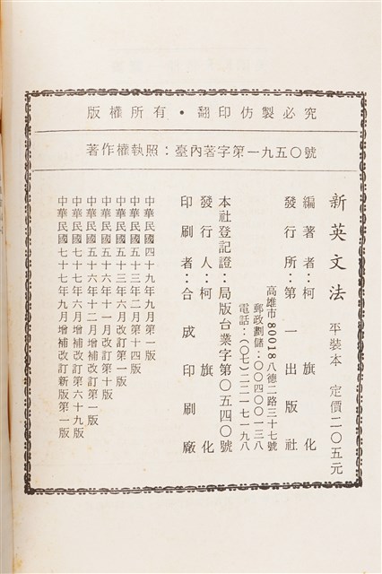 1.柯旗化編著《New English Grammer 中學適用新英文法(增補改訂新版)》,民國77年9月增補改訂新版第一版,由第一出版社印行。2.柯旗化的英語教科書事業啟蒙源於1955年,當時柯旗化遭受朋友背信而積欠負債,因而決定在自家開設了補習班補貼家用,期間整理編寫第一本《初中英語手冊》不久便獲得廣大學生迴響,當時委外印刷卻供不應求的現象,也使柯旗化於1958年自行成立第一出版社,開啟他的教科書出版事業,其中1960年出版的《新英文法》等書,成為當時英語科最主流的教科書,也是柯旗化最廣為人知的著作。然而隔年柯旗化再度被捕入獄,而柯旗化將在獄中自殺未遂的鬱卒轉化成撰寫教科書的動力,不久便默默的進行再版的增訂,空前的熱銷也支持著柯旗化再版修訂的工作,由妻子柯蔡阿李接下出版社的營運,而柯旗化則是在15年的獄中持續不懈地增訂修改再寄回出版,維持家裡經濟。3.《新英文法》為柯旗化的重要著作,60年代正逢英語學習熱潮,《新英文法》也成為人手一本拜讀的教科書,空前的熱銷令家人子女得以平穩的渡過柯旗化在獄中的堅苦時期,出獄後也支持著柯旗化有相當的經濟基礎,投入台灣文化書籍等出版事業,對於教育界或是柯旗化來說,《新英文法》使兩者的成就皆從這本書的基礎上逐漸建構起來。