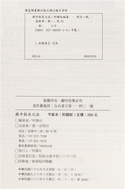 1.柯旗化編著《國中適用國中新英文法(新版)》,此版本為民國86年10月修訂一版二十一印(第39印),由第一出版社印行。2.柯旗化的英語教科書事業啟蒙源於1955年,當時柯旗化遭受朋友背信而積欠負債,因而決定在自家開設了補習班補貼家用,期間整理編寫第一本《初中英語手冊》不久便獲得廣大學生迴響,當時委外印刷卻供不應求的現象,也使柯旗化於1958年自行成立第一出版社,開啟他的教科書出版事業,其中1960年出版的《新英文法》等書,成為當時英語科最主流的教科書,也是柯旗化最廣為人知的著作。然而隔年柯旗化再度被捕入獄,而柯旗化將在獄中自殺未遂的鬱卒轉化成撰寫教科書的動力,不久便默默的進行再版的增訂,空前的熱銷也支持著柯旗化再版修訂的工作,由妻子柯蔡阿李接下出版社的營運,而柯旗化則是在15年的獄中持續不懈地增訂修改再寄回出版,維持家裡經濟。3.《新英文法》為柯旗化的重要著作,60年代正逢英語學習熱潮,《新英文法》也成為人手一本拜讀的教科書,空前的熱銷令家人子女得以平穩的渡過柯旗化在獄中的堅苦時期,出獄後也支持著柯旗化有相當的經濟基礎,投入台灣文化書籍等出版事業,對於教育界或是柯旗化來說,《新英文法》使兩者的成就皆從這本書的基礎上逐漸建構起來。