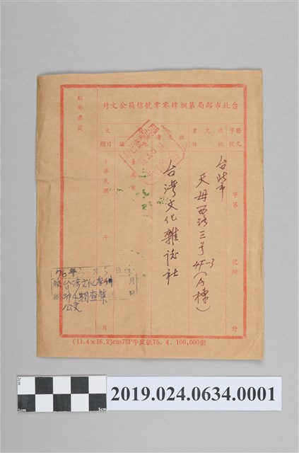 2019.024.0634.0001 1987年3月5日警備總部查禁《台灣文化季刊第四期》查禁公文封