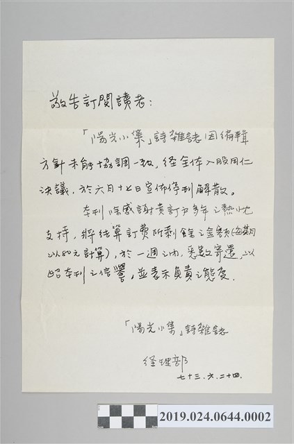 2019.024.0644.0002 陽光小集寄柯旗化停刊通知信紙(1984年6月24日)